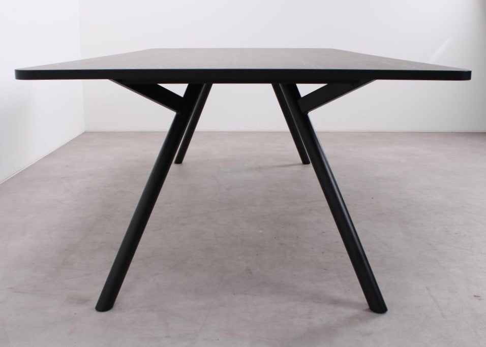 Der gebrauchte Bridge Tisch überzeugt durch seine schlichte Gestaltung und hohe Funktionalität. Das schwarze Metallgestell sorgt für eine stabile Basis, während die schwarze Melamin-Tischplatte mit feiner Holzmaserung dem Tisch eine moderne und zugleich warme Ausstrahlung verleiht. Die großzügigen Abmessungen und die abgerundeten Ecken machen den Bridge besonders einladend und praktisch. Ob im Besprechungsraum, in der Kantine oder im offenen Büro – dieser Tisch passt sich jeder Umgebung mühelos.