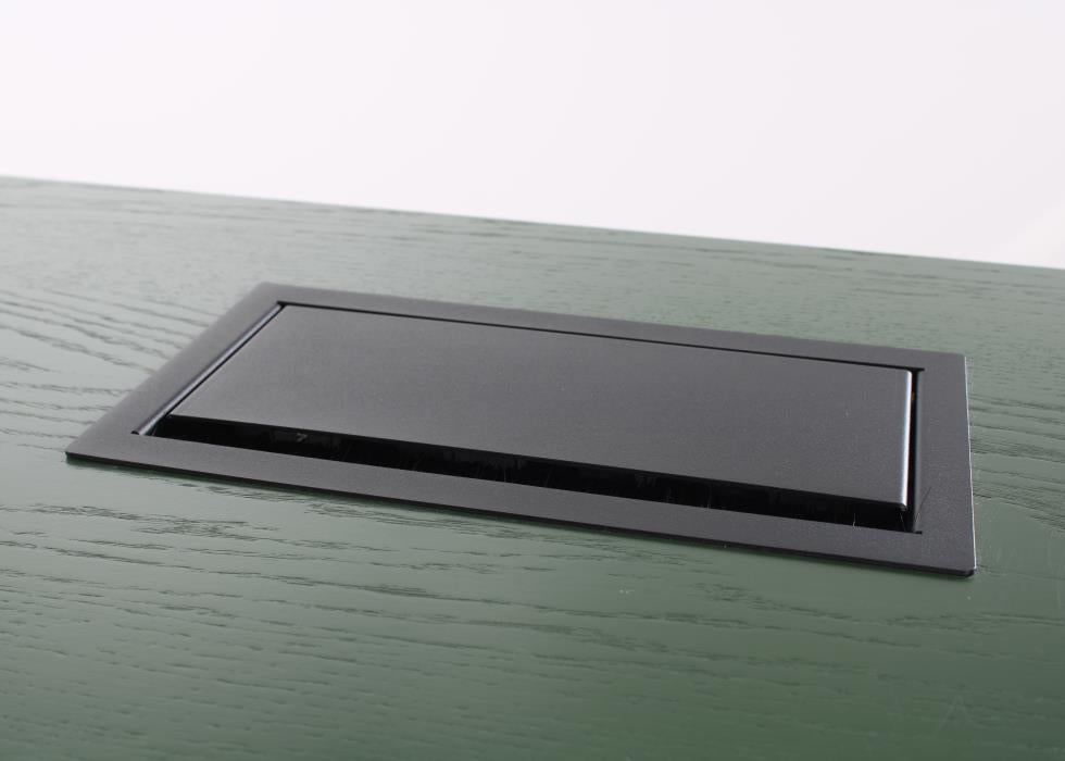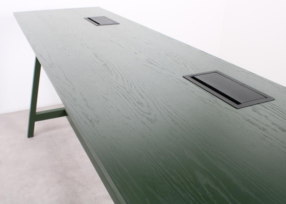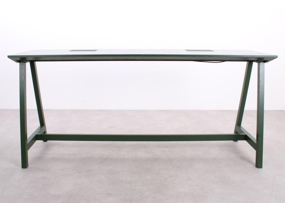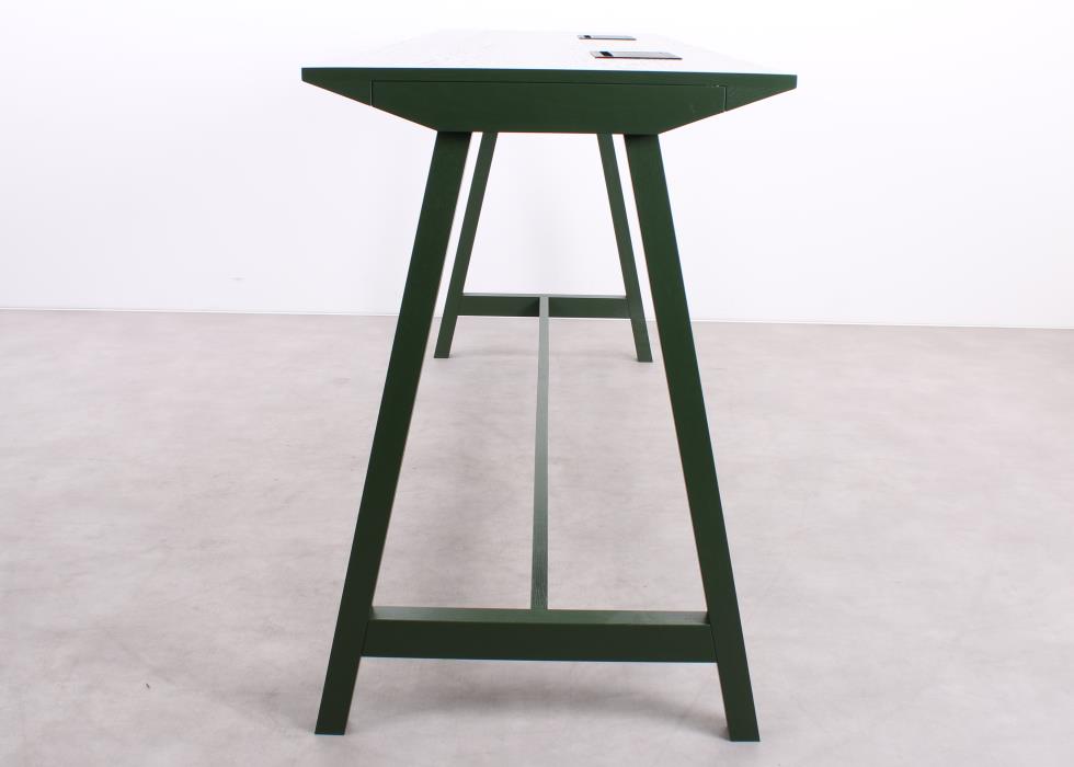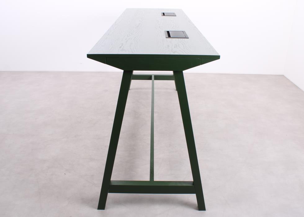 Der MR Bartisch verbindet stilvolle Optik mit Funktionalität und ist eine ideale Lösung für moderne Arbeitszonen. Die massive Tischplatte aus dunkelgrünem Holz mit markanter Facettenkante verleiht dem Tisch eine hochwertige, ausdrucksstarke Ausstrahlung. Zwei integrierte Powerdocks sorgen dafür, dass Strom jederzeit griffbereit ist – perfekt für Meetings, informelle Arbeitsplätze oder Empfangsbereiche, in denen Design und Funktion Hand in Hand gehen.