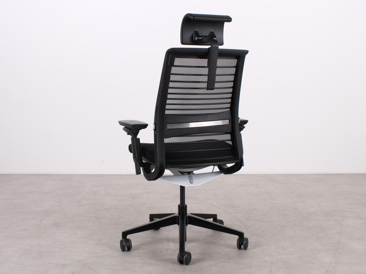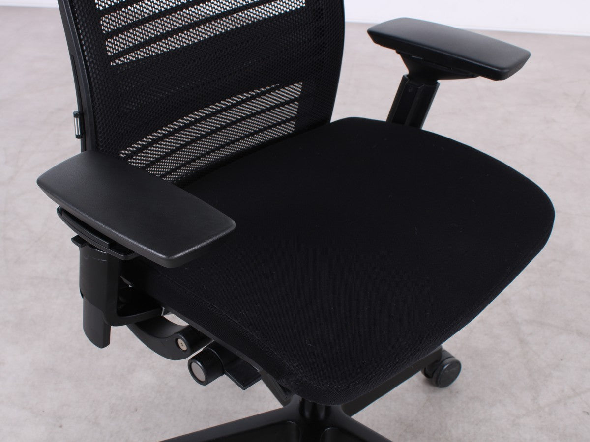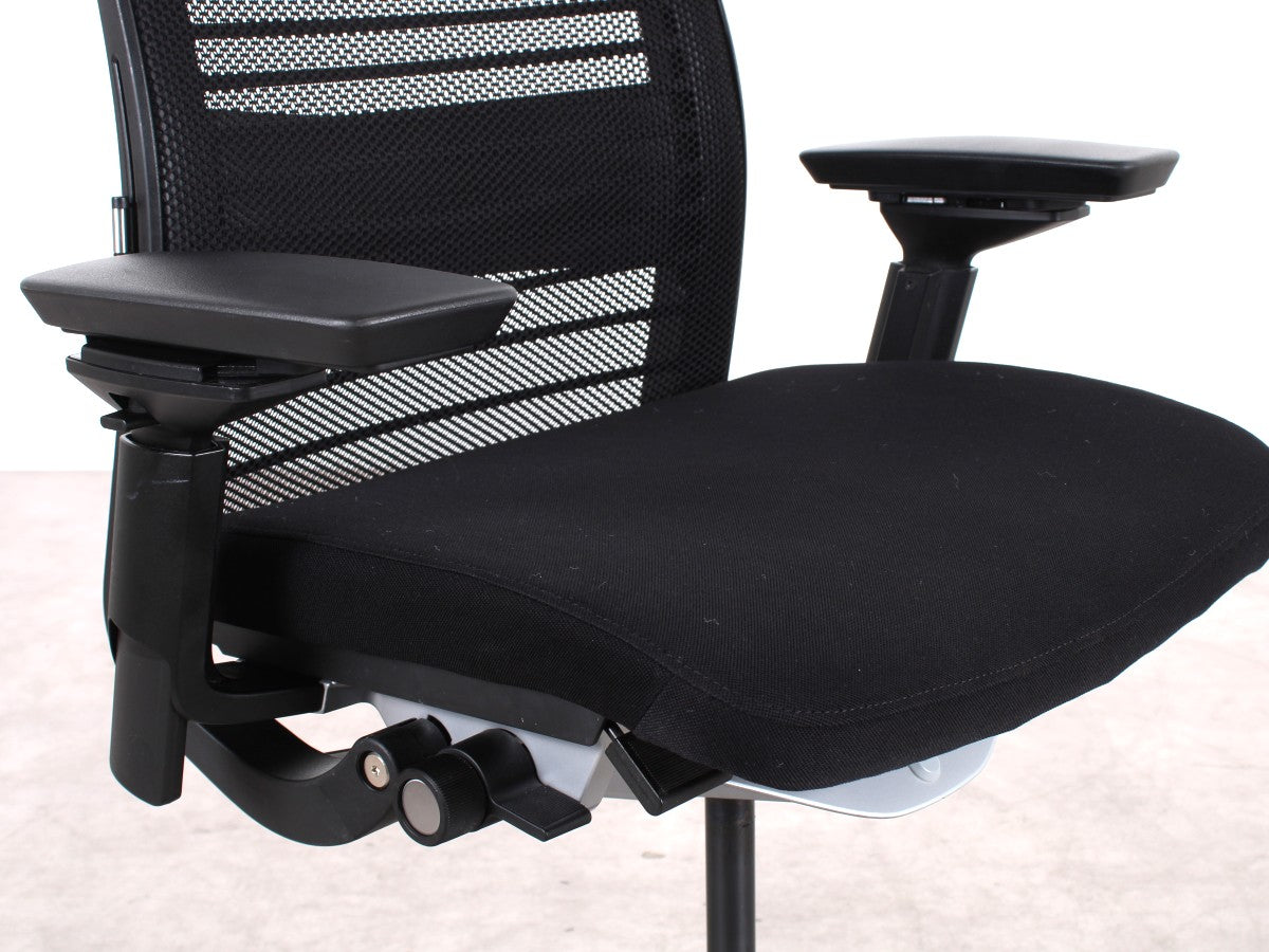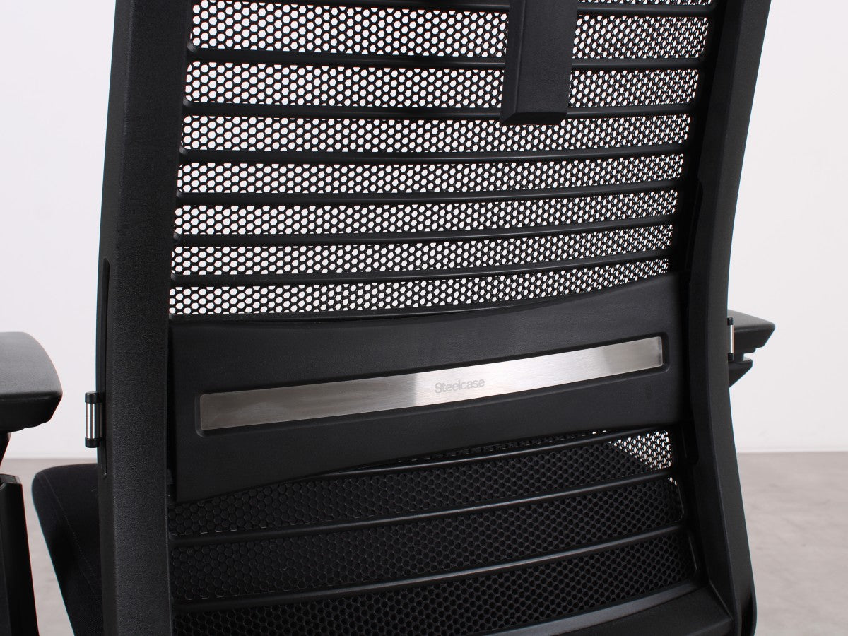 Der Steelcase Think V2 überzeugt mit ergonomischem Design und hoher Anpassungsfähigkeit. Die schwarze Sitzfläche aus Stoff und die atmungsaktive Netz-Rückenlehne sorgen für Komfort. Dank verstellbarer Sitzhöhe (47–58 cm), Sitztiefe (45–50 cm) und anpassbaren Armlehnen bietet er optimalen Halt. Die Synchronmechanik mit Gewichtseinstellung und neigbare Rückenlehne fördern eine gesunde Sitzhaltung. Das stabile Metall-Fußgestell rundet das Design ab.