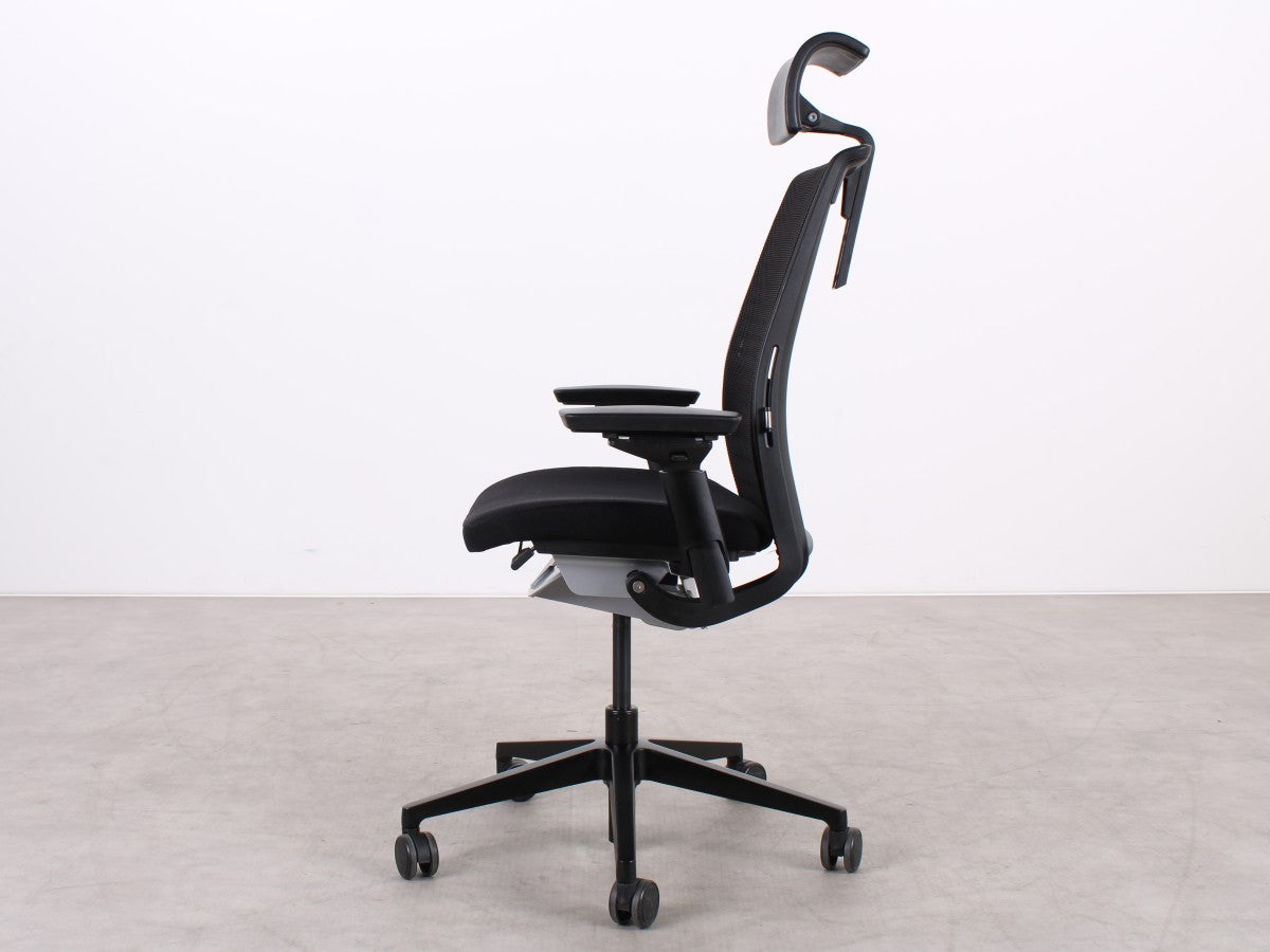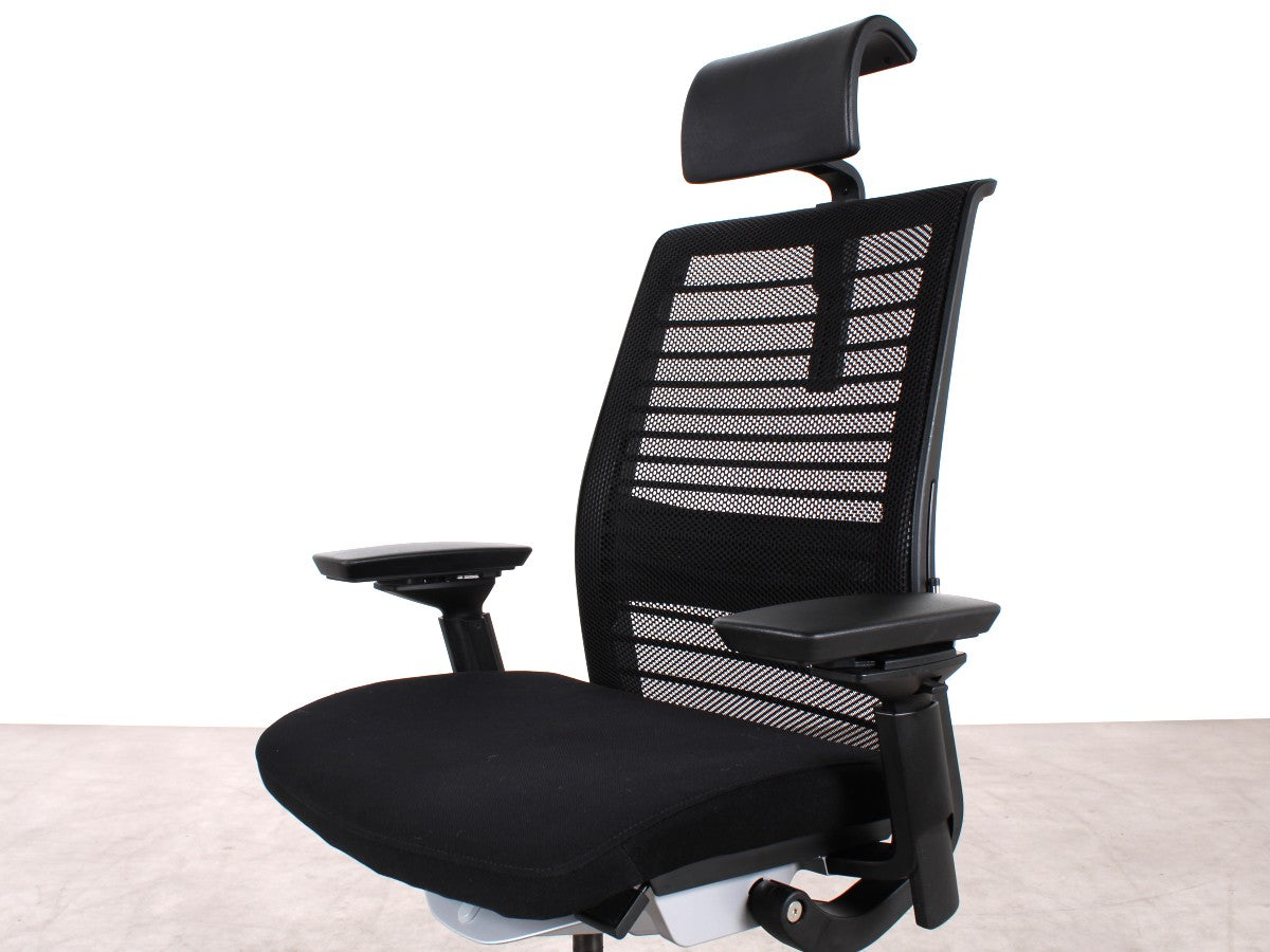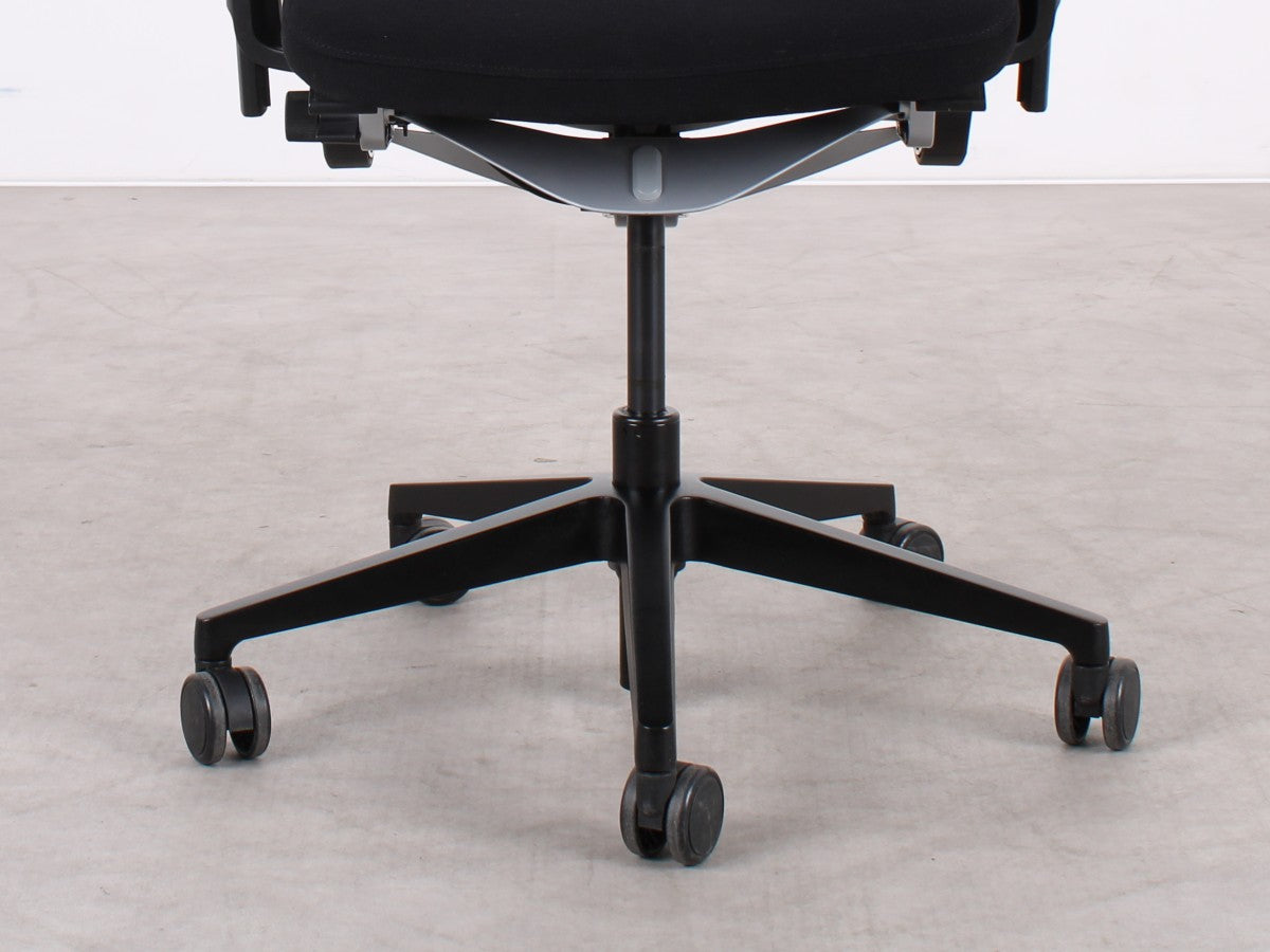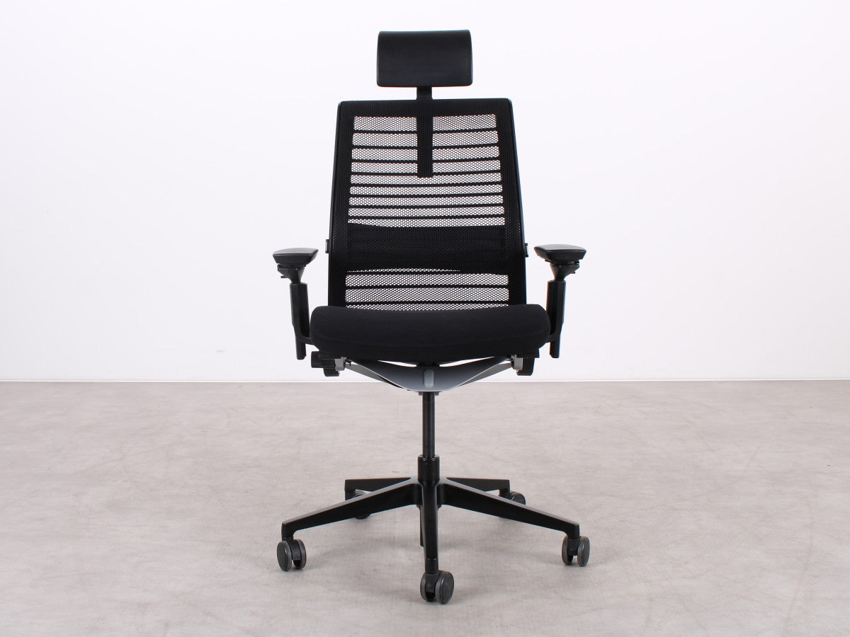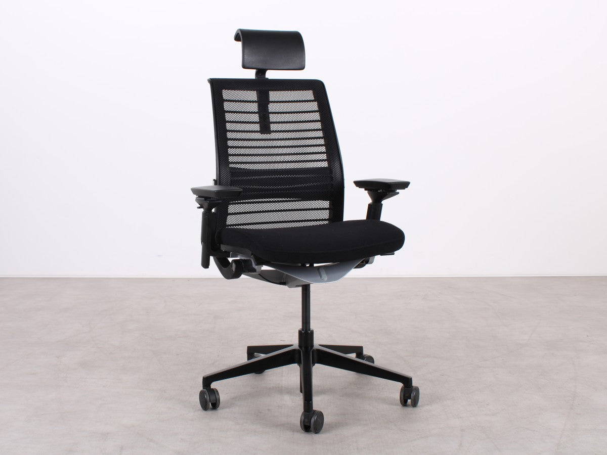 Der Steelcase Think V2 überzeugt mit ergonomischem Design und hoher Anpassungsfähigkeit. Die schwarze Sitzfläche aus Stoff und die atmungsaktive Netz-Rückenlehne sorgen für Komfort. Dank verstellbarer Sitzhöhe (47–58 cm), Sitztiefe (45–50 cm) und anpassbaren Armlehnen bietet er optimalen Halt. Die Synchronmechanik mit Gewichtseinstellung und neigbare Rückenlehne fördern eine gesunde Sitzhaltung. Das stabile Metall-Fußgestell rundet das Design ab.