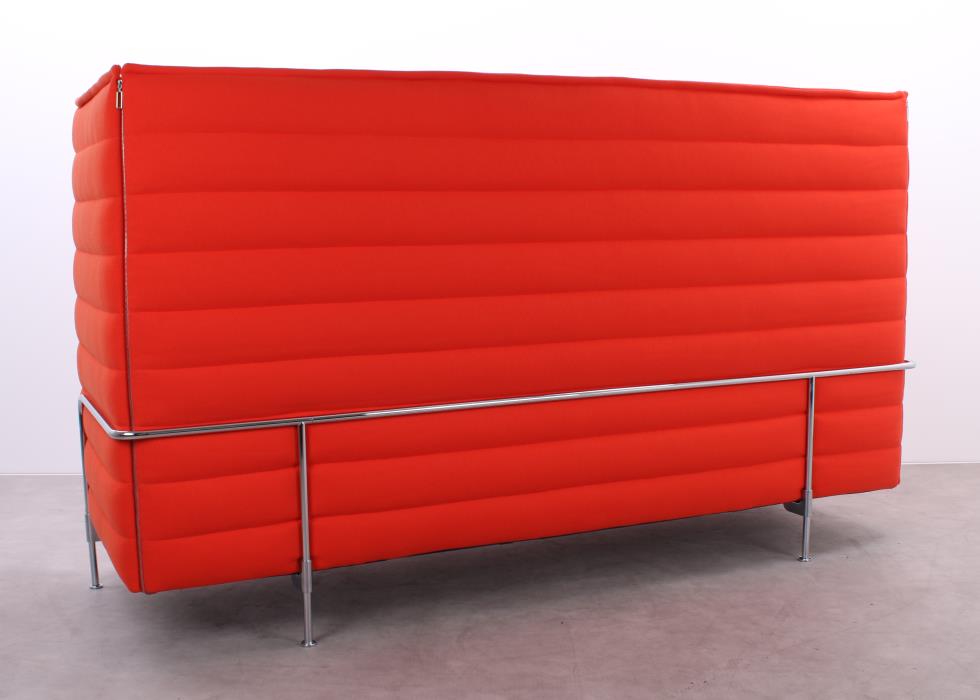Erleben Sie Stil, Komfort und Privatsphäre mit dem gebrauchten Alcove von Vitra, entworfen von Ronan & Erwan Bouroullec. Die lebhafte orangefarbene Polsterung aus recyceltem Polyester setzt einen kraftvollen Akzent und wird elegant getragen von einem verchromten Metall-Vierfußgestell. Die hohen Seiten- und Rückenelemente sorgen für akustische Abschirmung und schaffen eine angenehme, abgeschirmte Atmosphäre. Ob für entspanntes Loungen, informelle Meetings oder inspirierende Gespräche – der Alcove ist ein stilvoller Rückzugsort für moderne Arbeitsumgebungen.